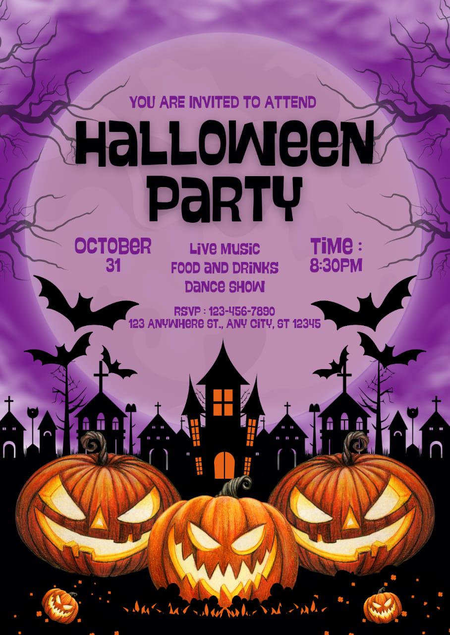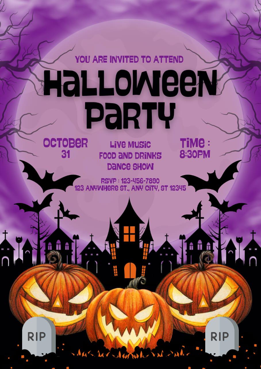 Pumpkin Party Video Invite, Gothic Rose Horror eCard, Editable Party Invitation, Spooky invitation card Make Your Halloween Party Unforgettable This purple-themed invitation brings a touch of mystery and magic to your celebration. With glowing jack-o'-lanterns and a moonlit graveyard, it’s ideal for evening events filled with music, dancing, and spooky