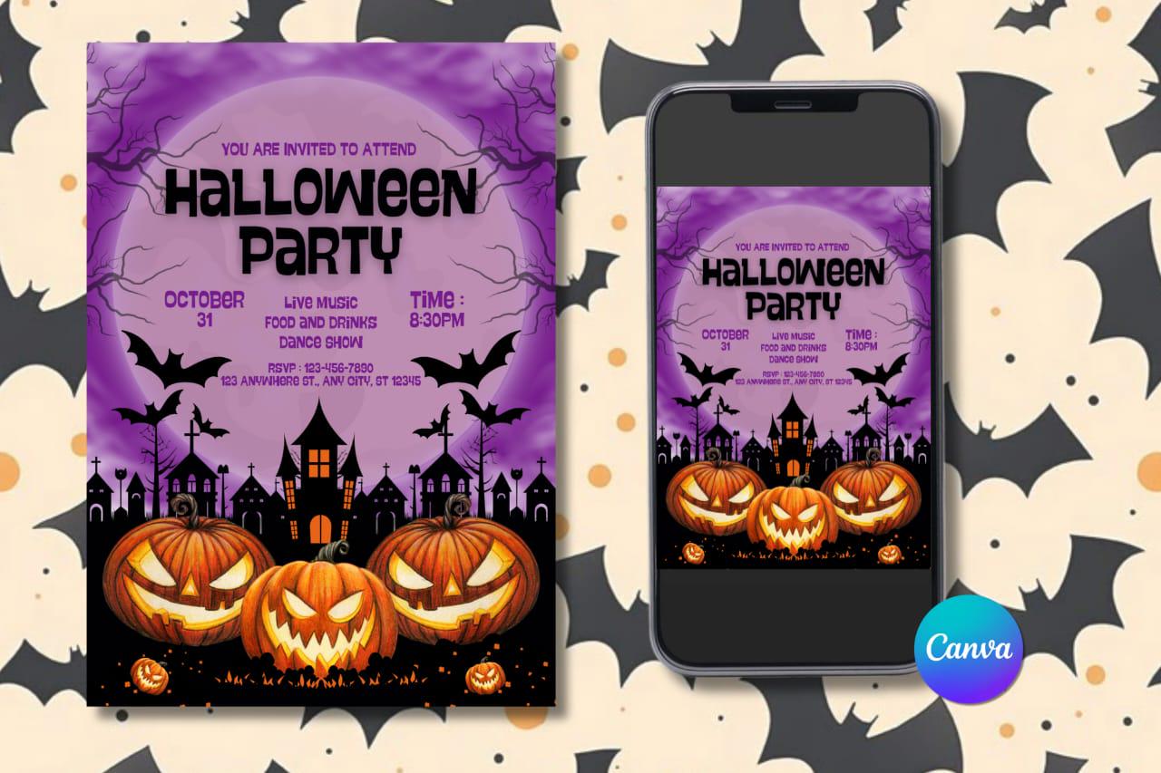 Digital Halloween Party Invitation, Pumpkin Party Video Invite, Gothic Rose Horror eCard, Editable Party Invitation, Spooky invitation card👻 Make Your Halloween Party Unforgettable This purple-themed invitation brings a touch of mystery and magic to your celebration. With glowing jack-o'-lanterns and a moonlit graveyard, it’s ideal for evening events filled with music, dancing, and spooky surprises.9999999999999 090909090 Digital Halloween Party Invitation, Pumpkin Party Video Invite, Gothic Rose Horror eCard, Editable Party Invitation, Spooky invitation card