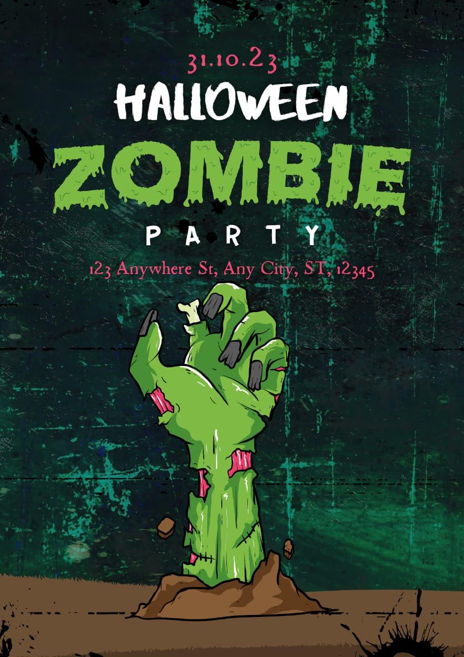 💀 Host a spooky Party That Rises from the Grave! This zombie-themed invitation is perfect for those who love the darker side of Halloween. With its gritty textures and bold graphics, it sets the stage for a night of spine-chilling fun, live music, and wild dance moves and many more