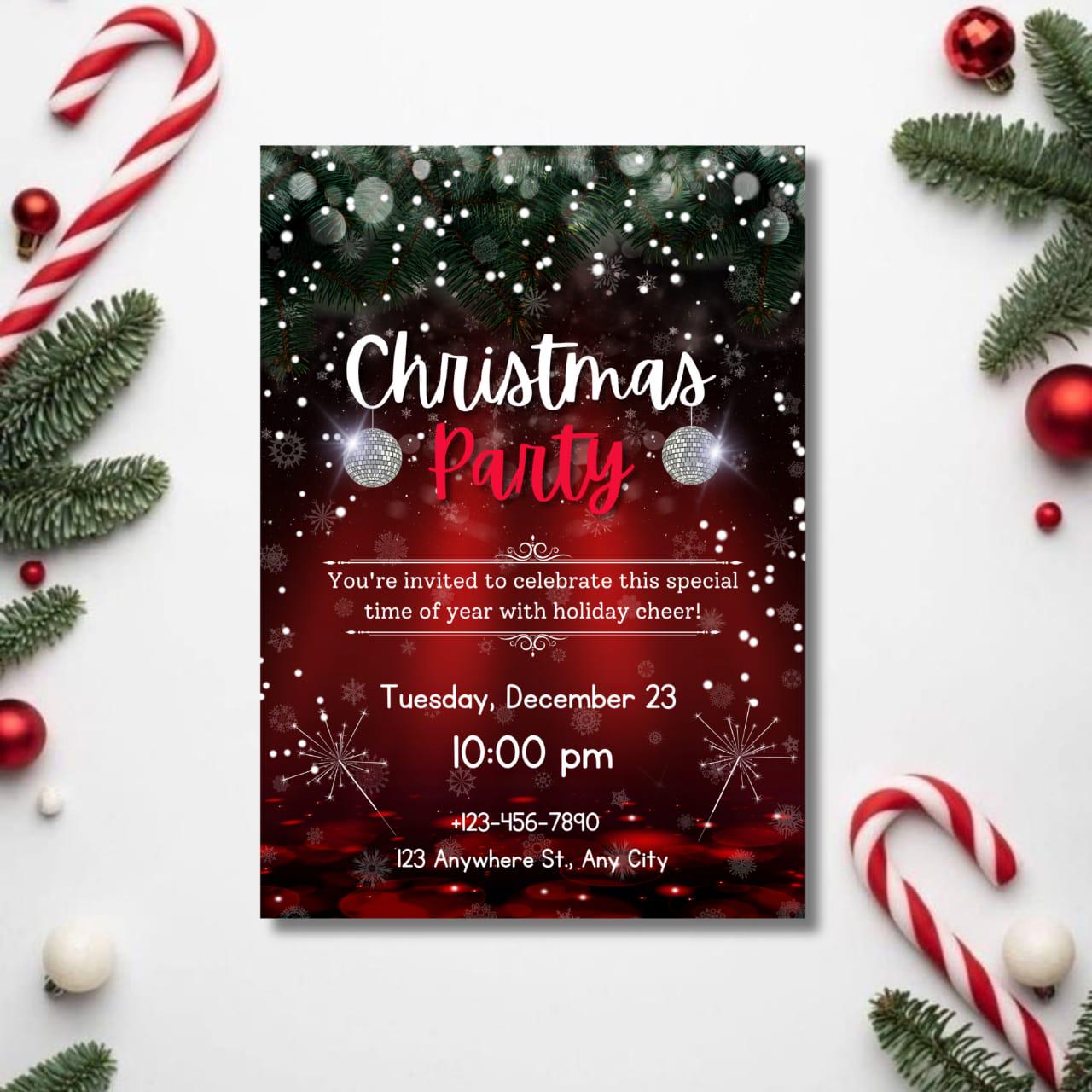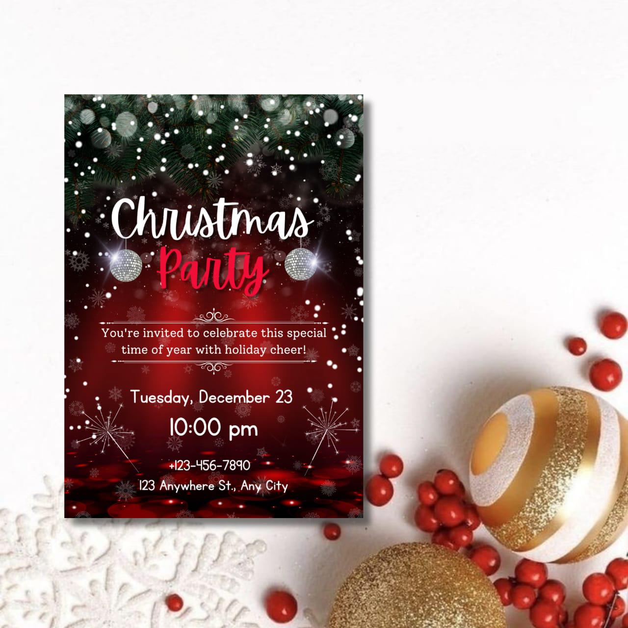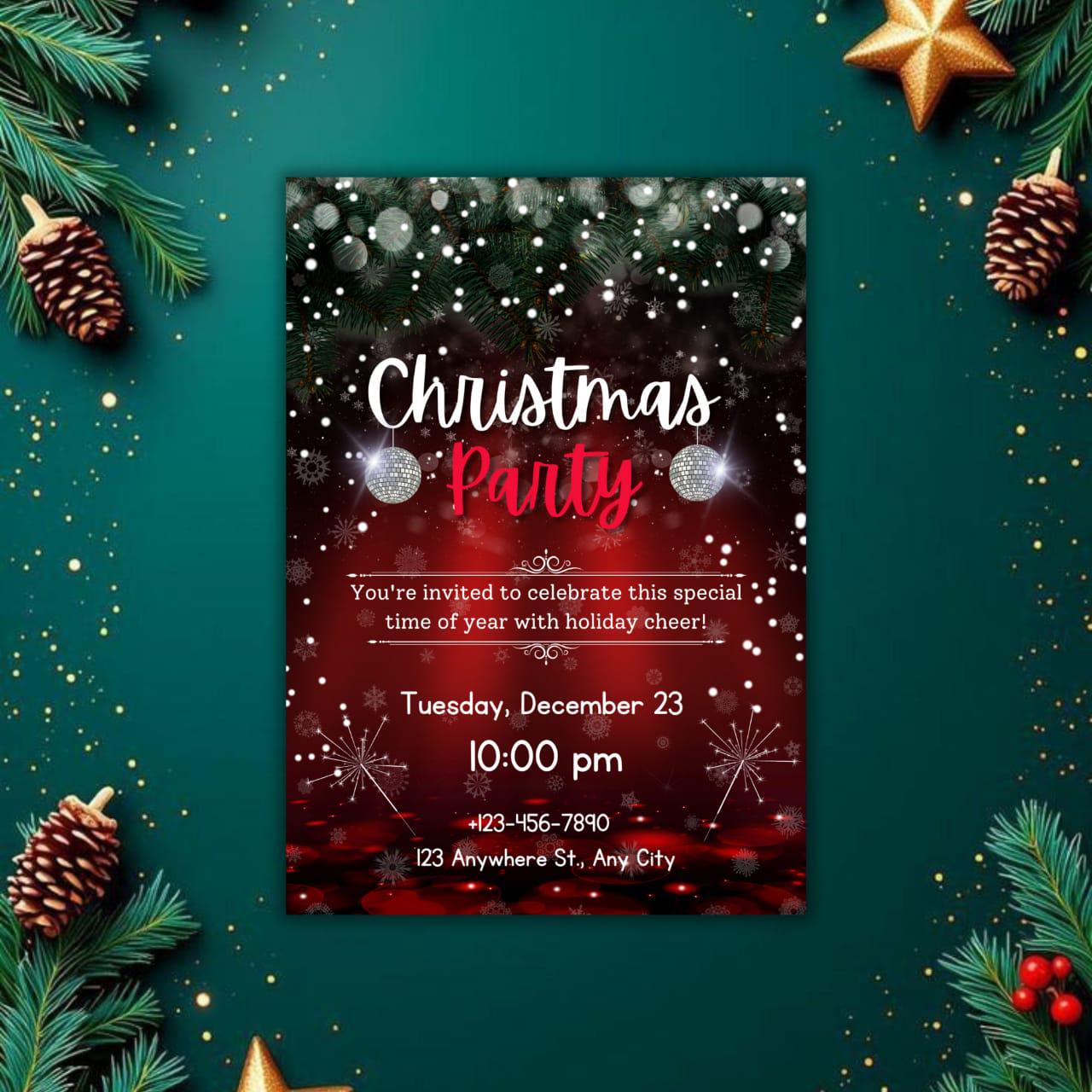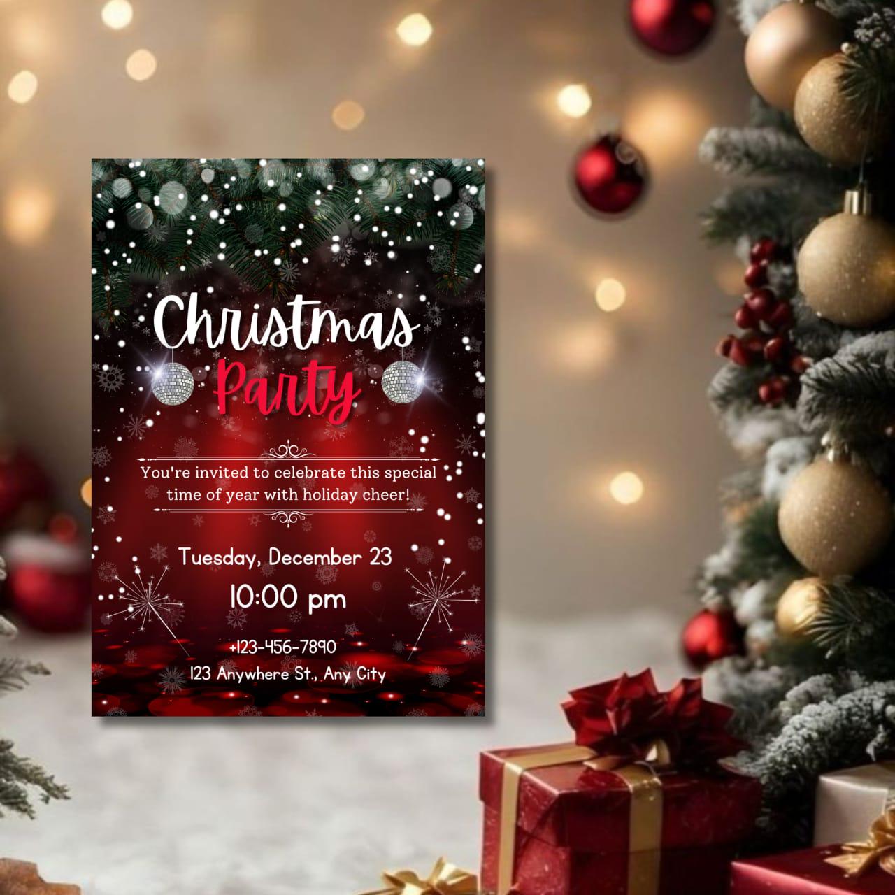 This invitation card is perfect for both digital sharing and at-home printing, catering to modern hosts who appreciate simplicity and style. Whether you're hosting a classic holiday dinner party or a vibrant winter celebration, the sleek layout and festive flair promise a memorable evening for your guests. Introduce a dash of festive charm with the included party invitation bow graphic, giving your holiday invitation the appearance of a beautifully wrapped gift. From formal Christmas dinner invitations to lively Friends mas celebrations, this Christmas party flyer offers endless flexibility and creativity. The high-resolution design ensures an impressive presentation, whether viewed digitally or held in hand, making it the perfect digital holiday invite for friends and family alike. Celebrate the season with an invitation that not only welcomes but wows. This elegant holiday invite is your canvas for creativity, inviting you into a world where festive gatherings are as much about the invitation as they are about the event itself. Revel in the holiday spirit with ease and sophistication, knowing your digital invitation is as joyous and welcoming as the celebration it announces. Embrace the winter festivities with this stunning invitation template, ensuring every holiday dinner invite is both personal and perfect.