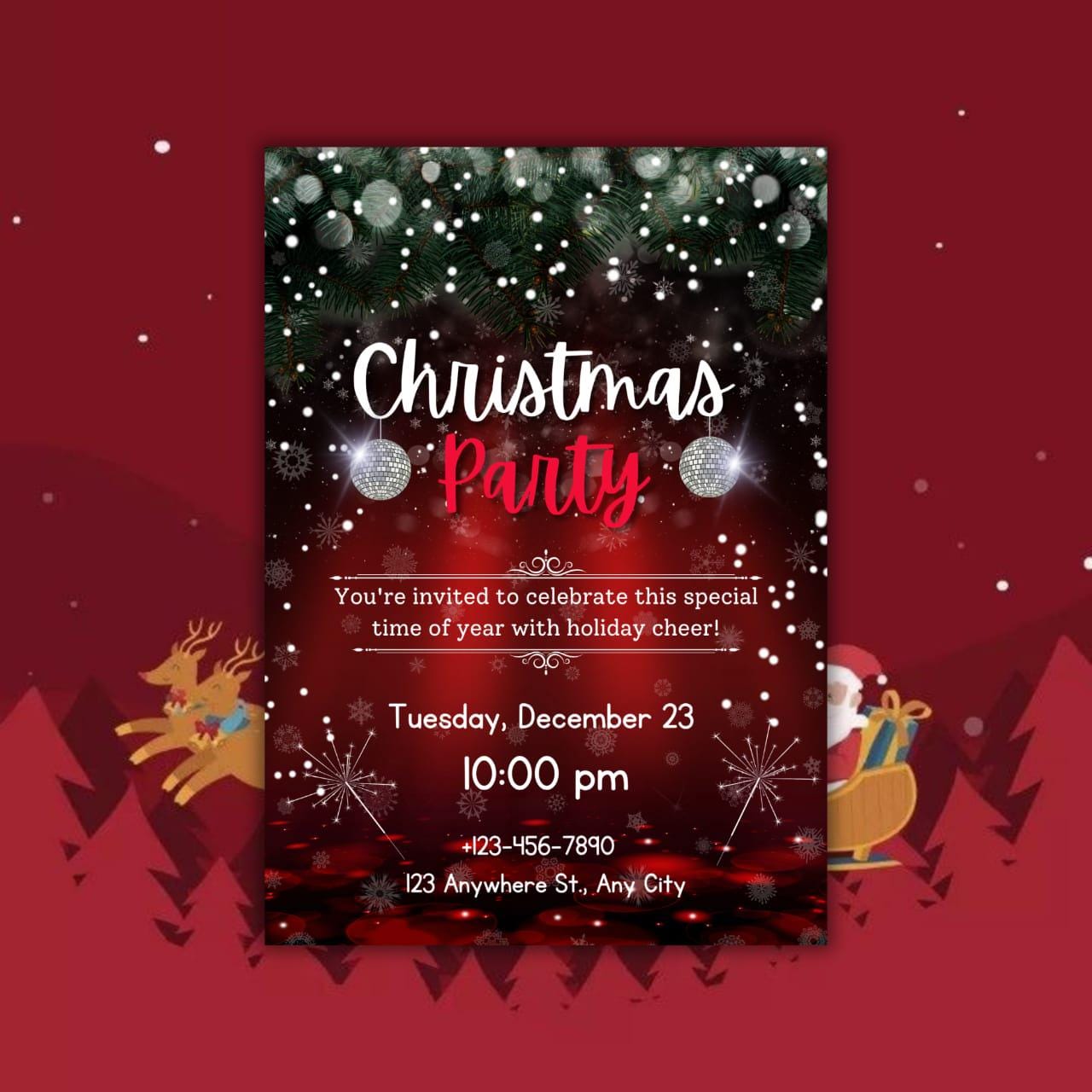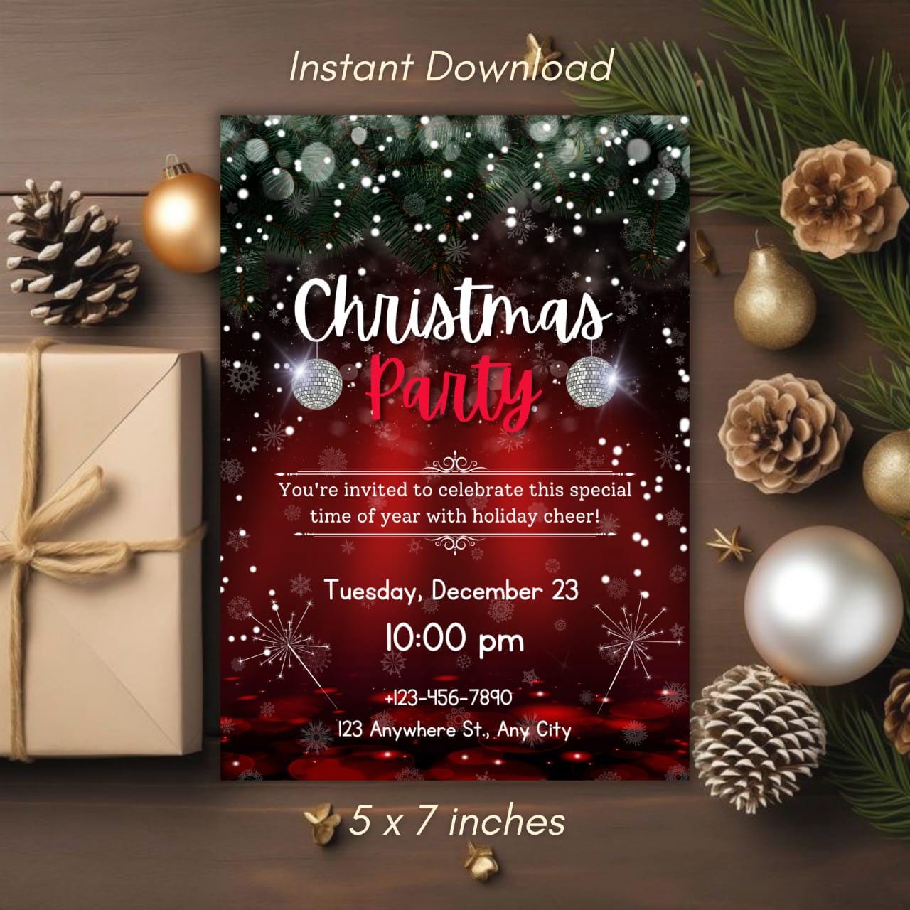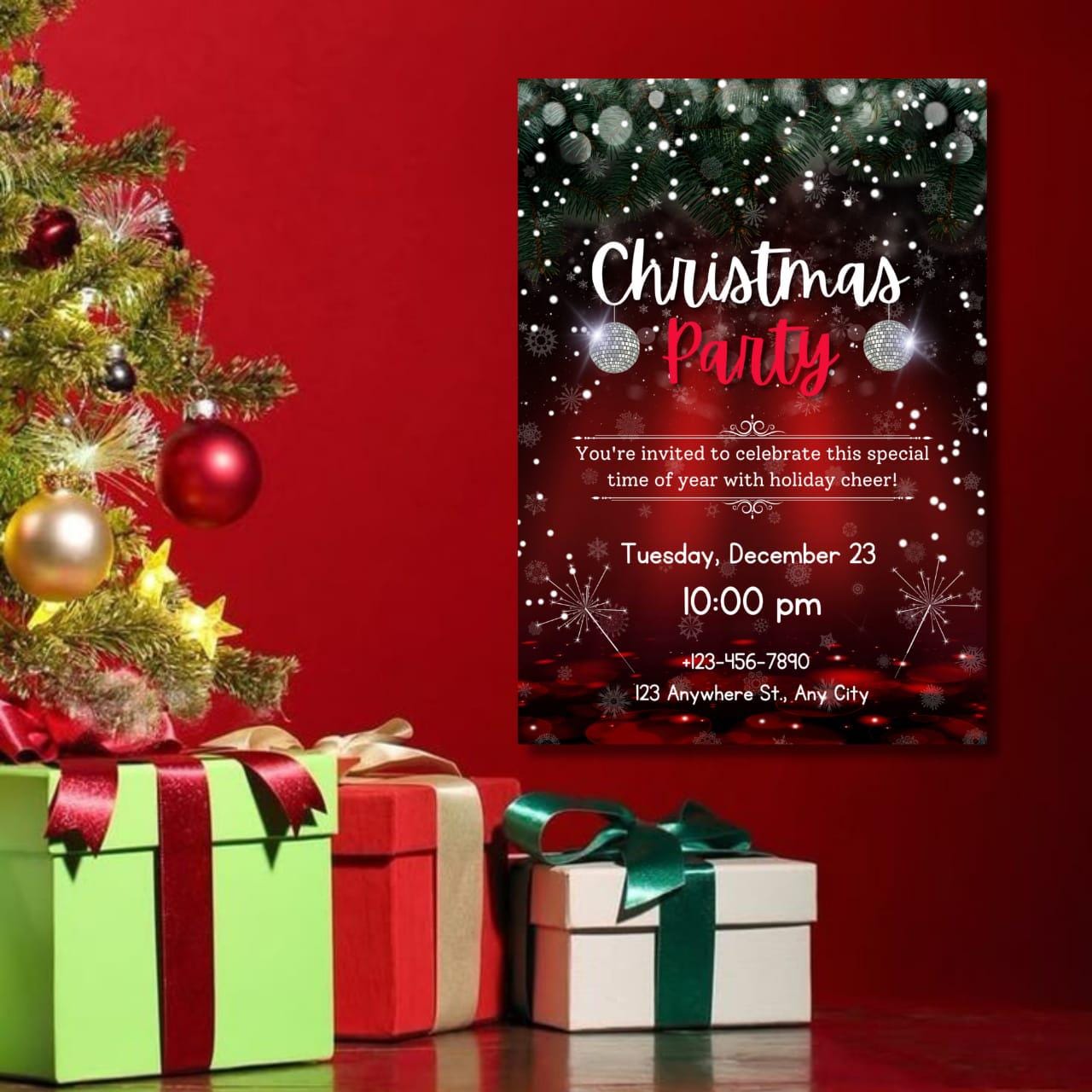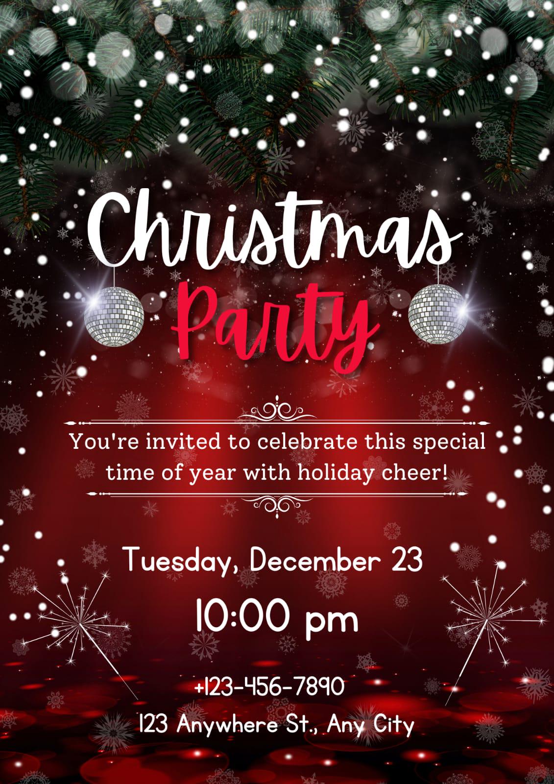 This invitation card is perfect for both digital sharing and at-home printing, catering to modern hosts who appreciate simplicity and style. Whether you're hosting a classic holiday dinner party or a vibrant winter celebration, the sleek layout and festive flair promise a memorable evening for your guests. Introduce a dash of festive charm with the included party invitation bow graphic, giving your holiday invitation the appearance of a beautifully wrapped gift. From formal Christmas dinner invitations to lively Friends mas celebrations, this Christmas party flyer offers endless flexibility and creativity. The high-resolution design ensures an impressive presentation, whether viewed digitally or held in hand, making it the perfect digital holiday invite for friends and family alike. Celebrate the season with an invitation that not only welcomes but wows. This elegant holiday invite is your canvas for creativity, inviting you into a world where festive gatherings are as much about the invitation as they are about the event itself. Revel in the holiday spirit with ease and sophistication, knowing your digital invitation is as joyous and welcoming as the celebration it announces. Embrace the winter festivities with this stunning invitation template, ensuring every holiday dinner invite is both personal and perfect.